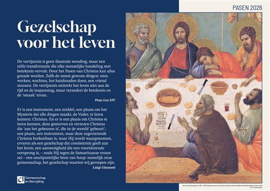 “Gezelschap voor het leven”. De woorden van paus Leo XIV en don Giussani met een detail uit het schilderij Het Laatste Avondmaal van Duccio di Buoninsegna dat zich bevindt in het Museo dell'Opera della Metropolitana in SienaDe verrijzenis is geen theatrale wending, maar een stille transformatie die elk menselijke handeling met betekenis vervult. Door het Pasen van Christus kan alles genade worden. Zelfs de meest gewone dingen: eten, werken, wachten, het huishouden doen, een vriend steunen. De verrijzenis onttrekt het leven niet aan de tijd en de inspanning, maar verandert de betekenis en de “smaak” ervan.